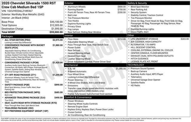 Experience the power and capability of the 2020 Chevrolet Silverado 1500 RST. This exceptional full-size pickup is built to handle any task with ease, whether you're tackling tough jobs or seeking the ultimate in comfortable, versatile transportation.Boasting an impressive array of advanced features, the Silverado RST stands out from the crowd. Key highlights include:• ALL-STAR EDITION• Convenience Package with Bucket Seats• Convenience Package II• Z71 Off-Road Package• Safety Package• Trailering Package• Bose Premium Sound SystemUnder the hood, the Silverado RST is equipped with Chevrolet's renowned EcoTec3 5.3L V8 engine, delivering 355 horsepower and 383 lb-ft of torque. Paired with an 8-speed automatic transmission and 4-wheel drive, this powertrain provides the perfect balance of power and efficiency, with an EPA-estimated 16 city/22 highway mpg.The Silverado RST's impressive capabilities are further enhanced by its rugged yet refined design. From the bold exterior styling to the well-appointed, tech-savvy interior, every detail has been meticulously crafted to provide a premium driving experience. Enjoy the convenience of features like the Chevrolet Infotainment 3 Plus system, heated front seats and steering wheel, and a host of advanced safety technologies.This 2020 Chevrolet Silverado 1500 RST is a certified pre-owned vehicle, meaning it has been thoroughly inspected and reconditioned to meet our high standards. You can drive with confidence, knowing this truck has been meticulously maintained and is ready to take on your next adventure.Burke Promise Pricing means you can shop with total confidence. Every pre-owned vehicle we offer is thoroughly inspected and professionally reconditioned, ensuring it meets our high standards for quality, safety, and reliability. Plus, we price our vehicles aggressively—aiming to be one of the best values on the market. That's the Burke Promise: exceptional cars, exceptional value, save time and money—no guesswork, no pressure.